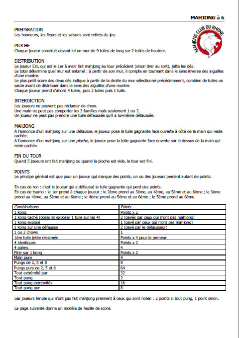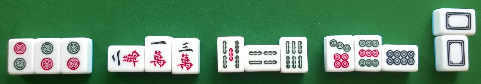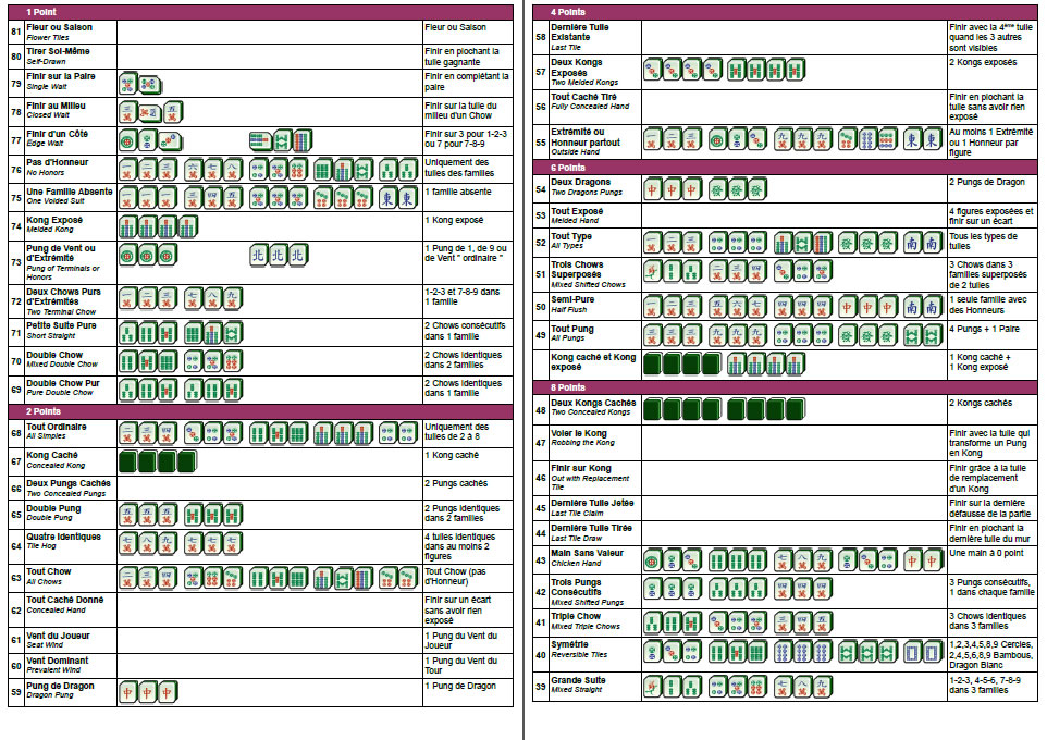 On n'oublie pas les kongs, les pungs de vents, de dragons ou d'extrémités et les combinaisons "duos" (double chow, double pung).